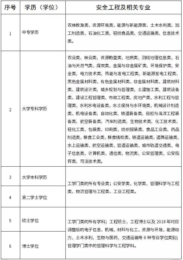 (一)具有安全工程及相關專業大學專科學歷,從事安全生產業務滿5年;或具有其他專業大學專科學歷,從事安全生產業務滿7年。