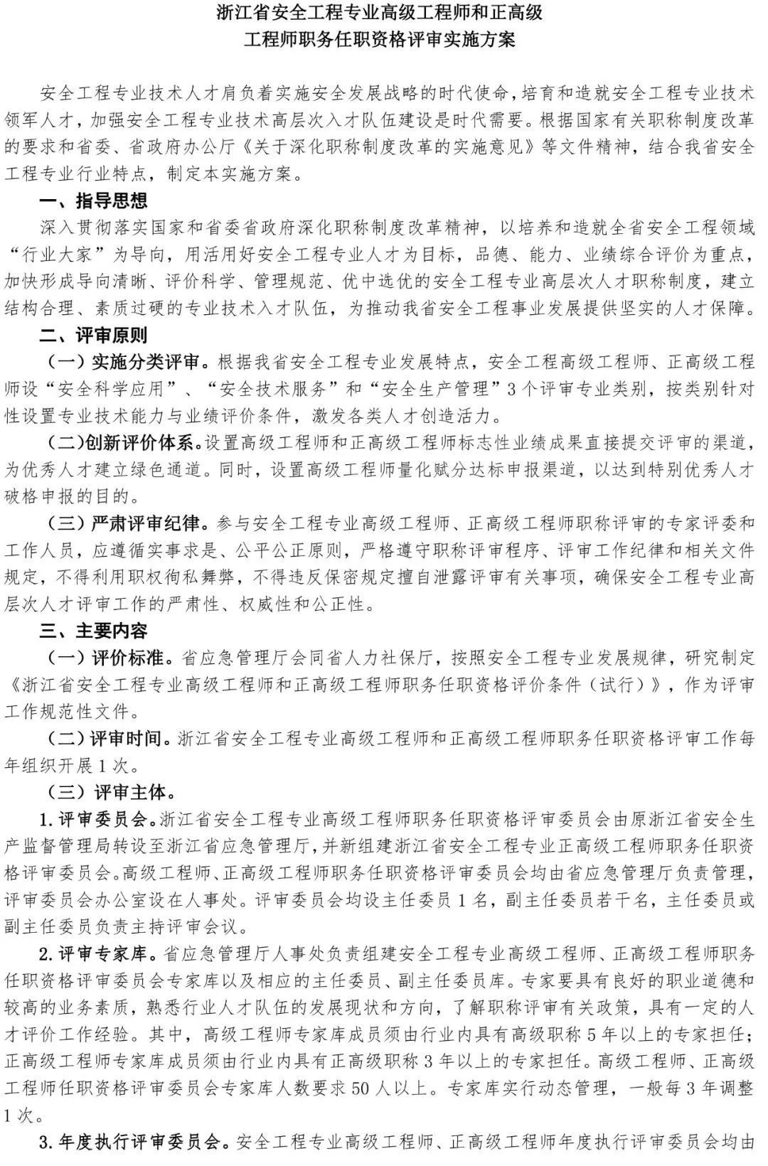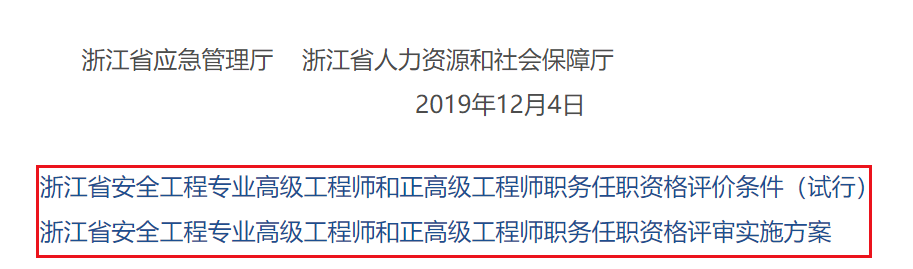 浙江省應急管理廳還發布了《浙江省安全工程專業高級工程師和正高級工程師職務任職資格評價條件(試行)》、《浙江省安全工程專業高級工程師和正高級工程師職務任職資格評審實施方案》。