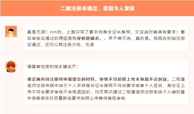 近日一名網(wǎng)友在咨詢二建注冊問題時(shí),忍不住吐槽自己初始注冊未通過的原因令人無語,怎么回事呢?接著往下看: