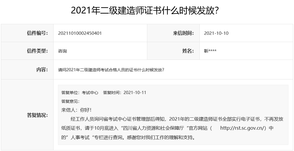 答:經工作人員詢問省考試中心證書管理部后得知,2021年的二級建造師證書全部實行電子證書,不再發放紙質證書,請于10月底進入“四川省人力資源和社會保障廳“官方網站中的”人事考試“專欄進行查詢。感謝您對我們工作的理解和支持。