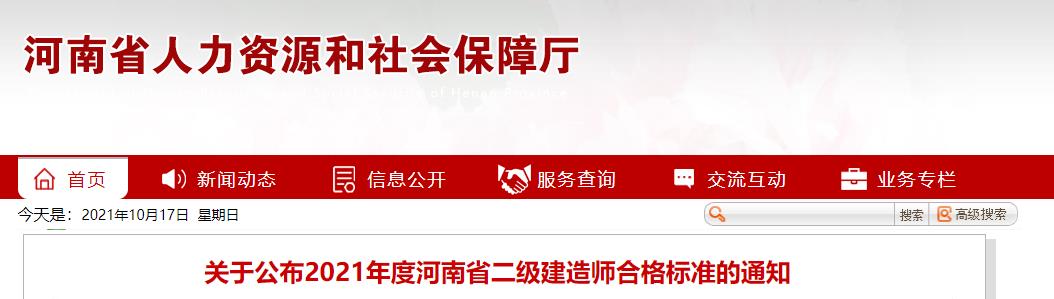 根據河南省人力資源和社會保障廳、河南省住房和城鄉建設廳《關于2021年度河南省二級建造師執業資格考試有關問題的通知》精神,現將2021年度河南省二級建造師考試合格標準予以公布。