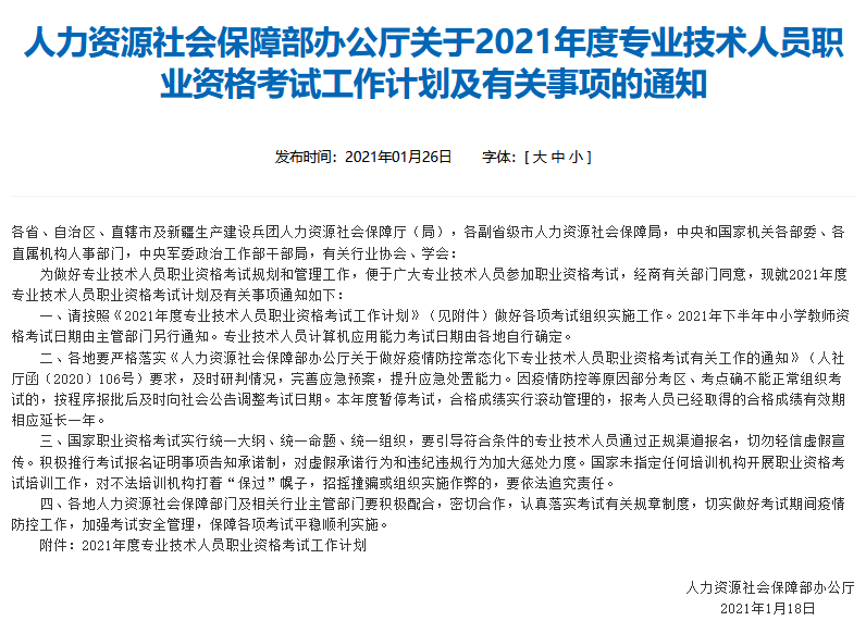 2021年01月26日,人社廳發﹝2021﹞4號《人力資源社會保障部辦公廳關于2021年度專業技術人員職業資格考試工作計劃及有關事項的通知》提到,2021年一級造價工程師考試時間確定為10月30日、31日.
