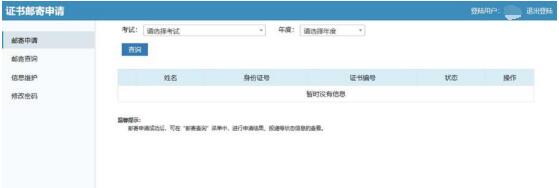 進行具體考試郵寄申請時,選擇左側菜單中的“郵寄申請” 項。點擊后操作界面如下圖: