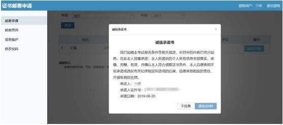 系統會首先有“誠信承諾書”的顯示,以及操作倒計時。倒計時結束后,點擊“同意”按鈕,系統處理后,將轉到郵寄申請信息錄入的界面。具體如下圖: