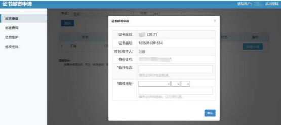 在“可申請”情況下,點擊“郵寄申請”按鈕,將彈出操作對話框。具體界面如下: