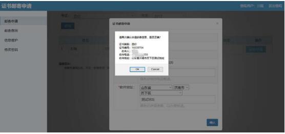 考生如實填寫收件電話、收件地址后,進行“確認”。系統將會有信息的再次確認。操作界面如下圖: