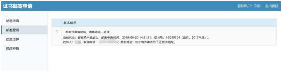 點擊“確定”按鈕后,系統將做郵寄申請信息的記錄,并返回處理結果。點擊后的操作界面如下圖:
