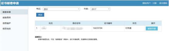 考生狀態為“郵寄預申請成功”,說明考生郵寄申請已成功。后期,進行證書狀態查詢的話,點擊“郵寄查詢”按鈕。點擊后的操作界面如下: