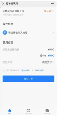 7.完成閱讀服務(wù)協(xié)議和隱私協(xié)議,后點(diǎn)擊“提交訂單”并完成郵費(fèi)支付;