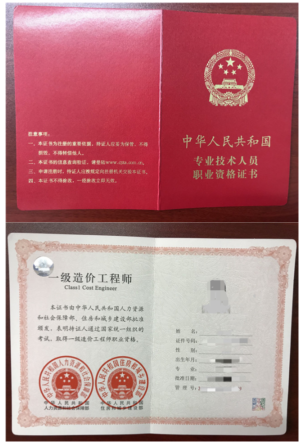一級造價工程師證書職業資格證書樣例