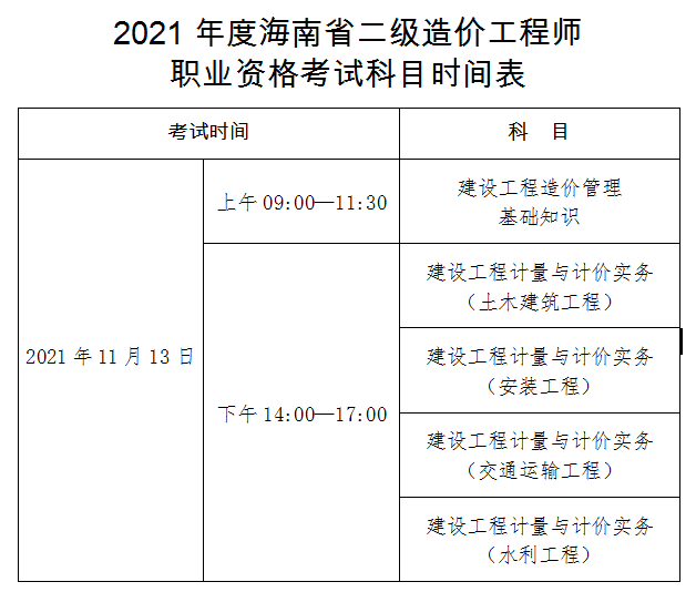 考試時(shí)間為2021年11月13日全天。建設(shè)工程造價(jià)管理基礎(chǔ)知識(shí)(閉卷,考試時(shí)間2.5小時(shí));建設(shè)工程計(jì)量與計(jì)價(jià)實(shí)務(wù)(土木建筑工程、安裝工程、交通運(yùn)輸工程、水利工程)(閉卷,考試時(shí)間各為3小時(shí))。