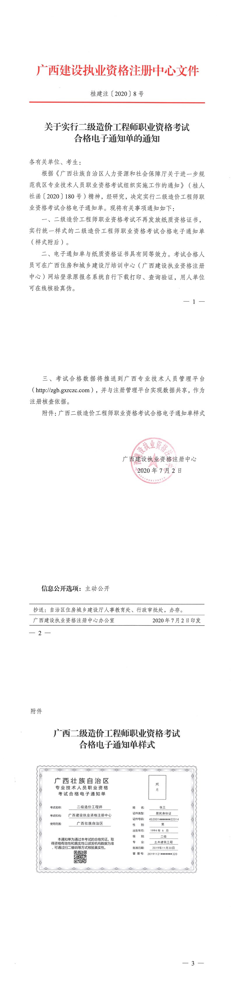 廣西2020年二級造價工程師實行合格電子通知單