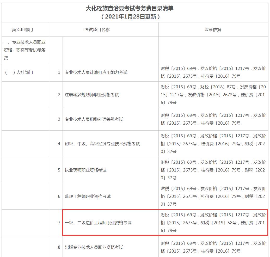大化瑤族自治縣考試考務費目錄清單(2021年1月28日更新)